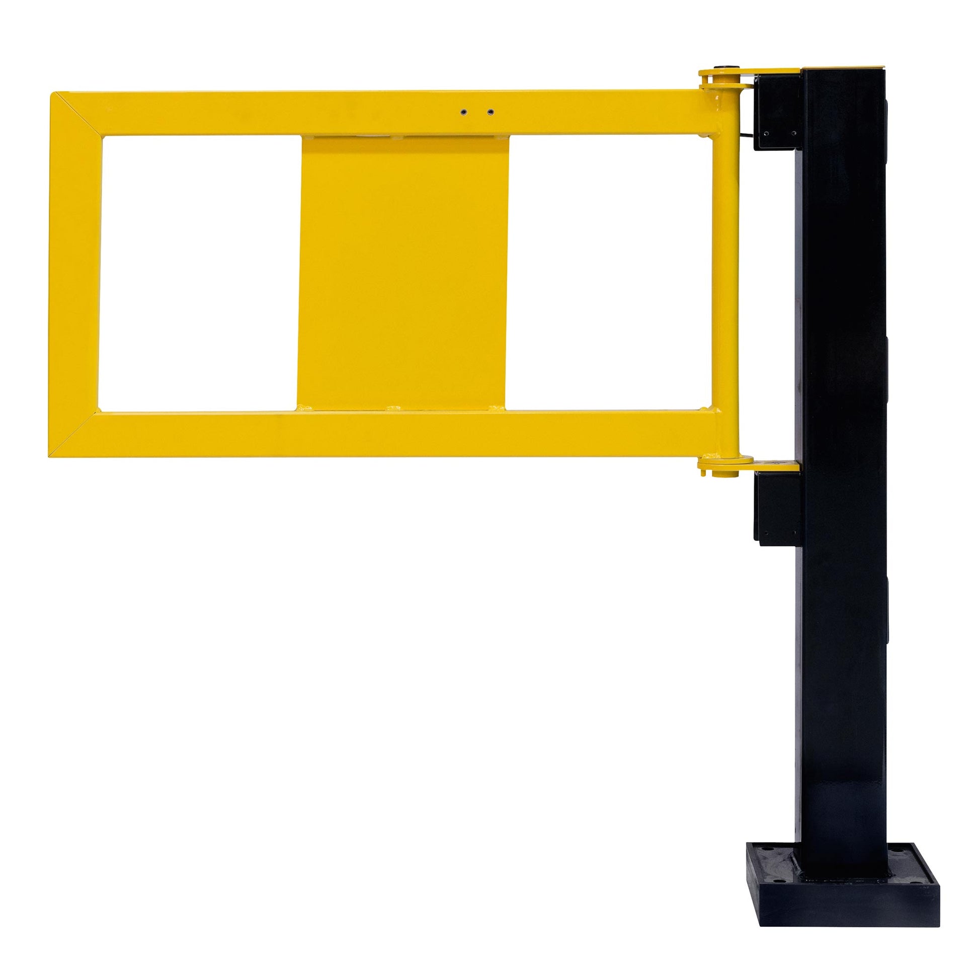 Selbstschließende Geländer-Tür aus Stahl. Manuelle Ausführung oder mit Gasdruckfeder. Abgestimmt auf das Rammschutz-Geländer Hybrid. Mit Schutzblende für zusätzliche Stabilität, Sichtbarkeit und zum Aufkleben von Warnhinweisen.