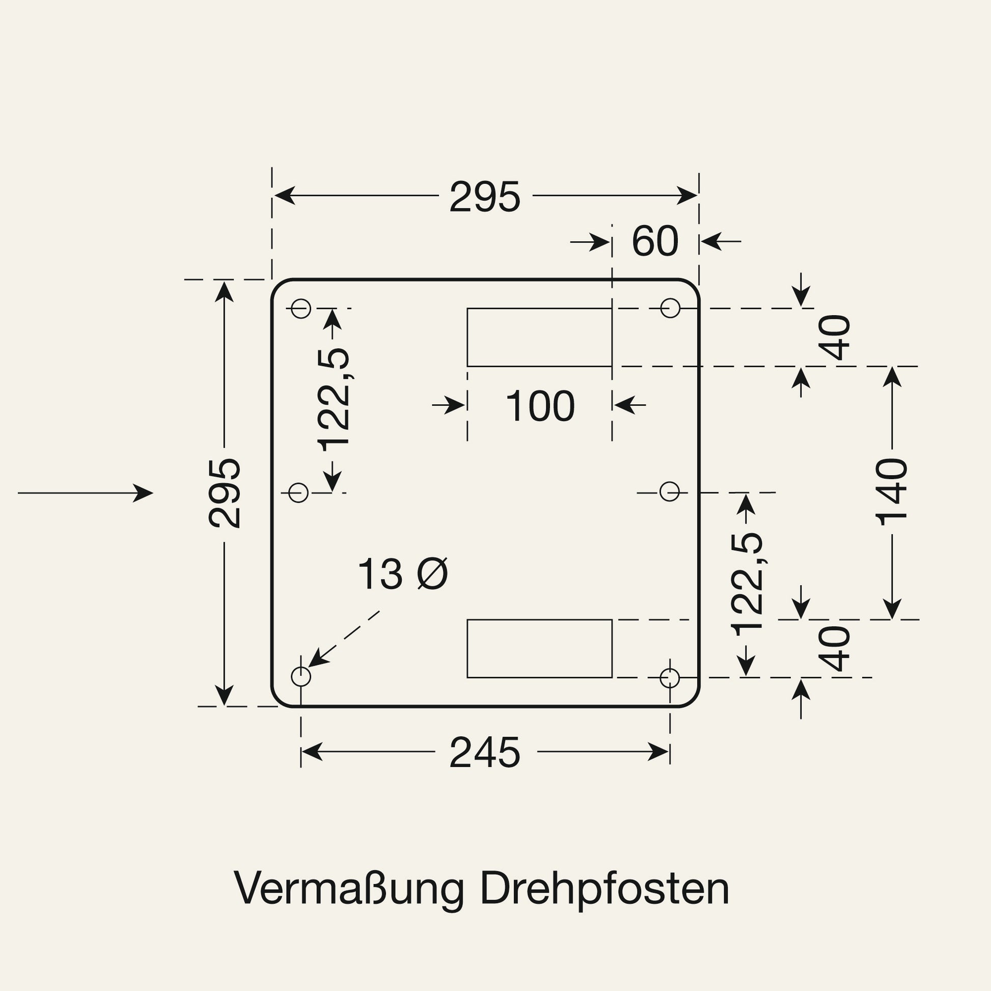 - Drehpfosten: 220 x 100 x 1.000 mm, Bodenplatte: 295 x 295 x 10 mm