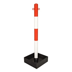 Pfosten feuerverzinkt und kunststoffbeschichtet, mit zwei Ösen zum Einhängen einer Kette. Die befüllbare Bodenwanne aus Stahl ist schwarz rostschutzlackiert.