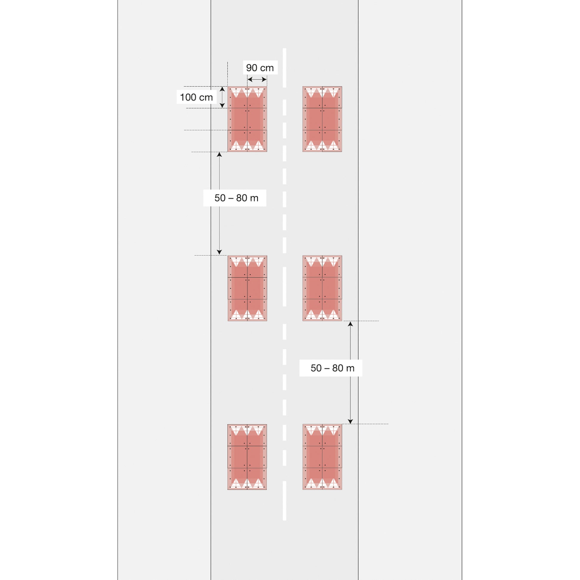 Für das flächenhafte Erreichen einer Zielgeschwindigkeit (V85) von max. 30 km/h werden die Kissen längs verlegt. Die niedrigere Rampenneigung – in Verbindung mit dem „angenehmen“ Auf- und Abfahrgefühl - erhöht die Akzeptanz der Verkehrsteilnehmer.