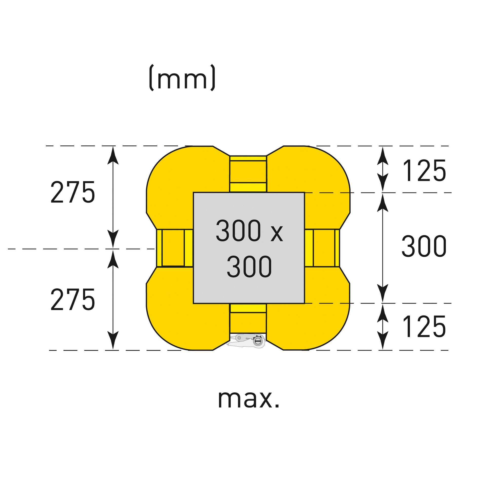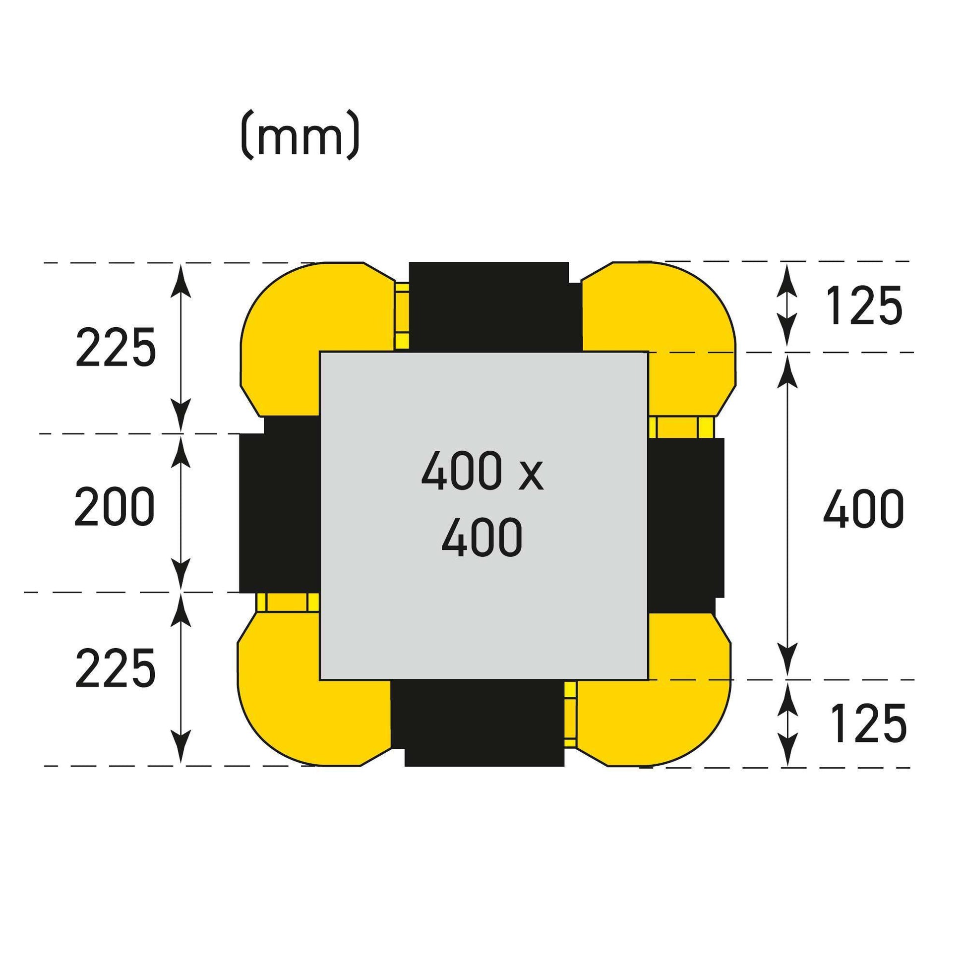 Die Seitenteile der vier Einzelelemente lassen sich ineinander schieben und decken alle Innendurchmesser von 200 x 200 mm bis 300 x 300 mm, einschließlich der Rechteckgrößen (z.B. 200 x 300 mm), ab.